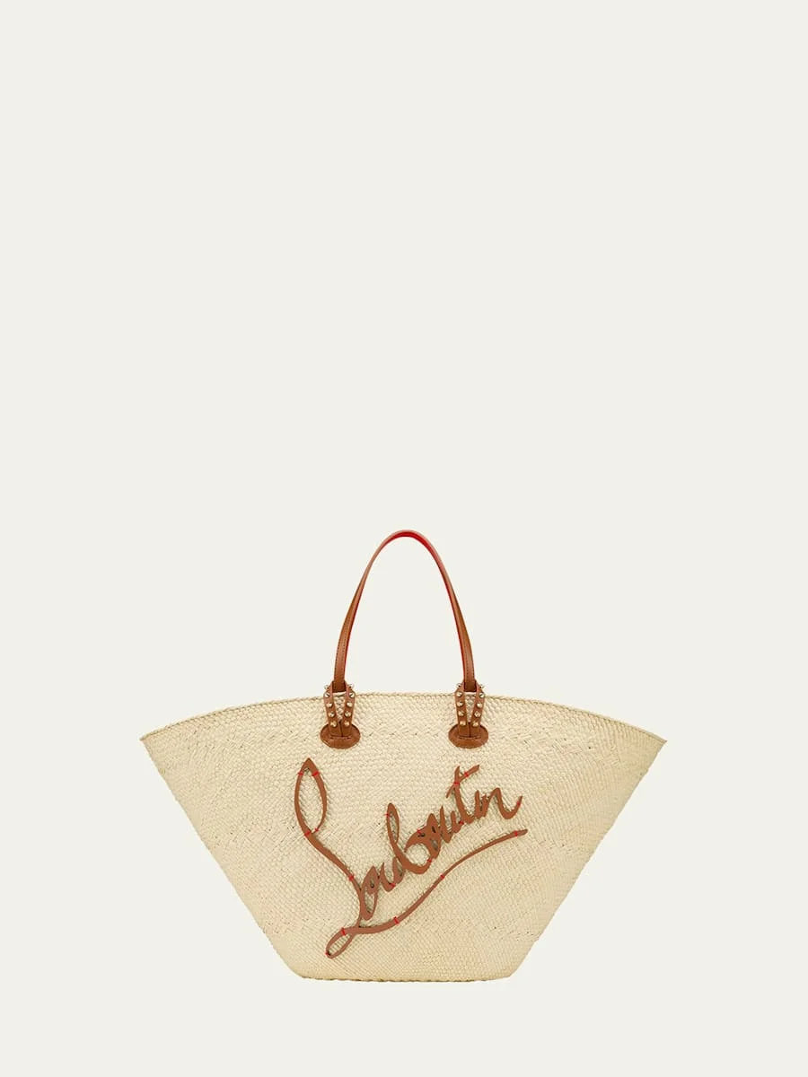 Christian Louboutin "Cabata" raffia basket tote bag with logo leather accent Shoulder straps with spike accents Open top with self-tie closure Lining: Raffia Approx. 7.5"H x 9.8"W x 4.7"D Made in Spain Online Inquiries: BGS21_V6CJ2| Store Inquiries: #4888964