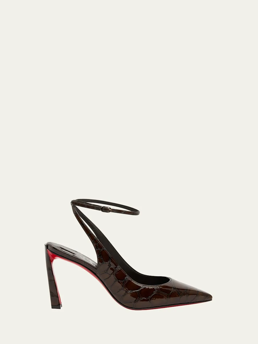 Christian Louboutin "Condora" pumps in croc-embossed patent calf leather 3.25 in / 85 mm stiletto heel Pointed toe Adjustable ankle strap Signature Louboutin red leather outsole Lining: Unlined Made in Italy Online Inquiries: BGS21_X6W9K| Store Inquiries: #5017894