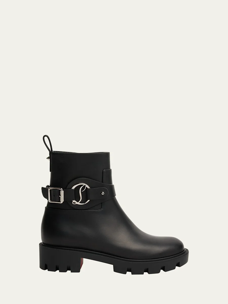 The "Dianouchette" ankle boots by Christian Louboutin are made from smooth calf leather with silver-tone side logo hardware atop a chunky lug sole Stacked flat heel Round toe Adjustable buckle strap Pull-tab with signature stud hardware at backstay Side zipper eases dress Signature Louboutin red leather outsole Made in Italy Online Inquiries: BGS21_X6ZBY| Store Inquiries: #5070090