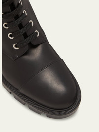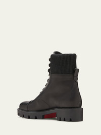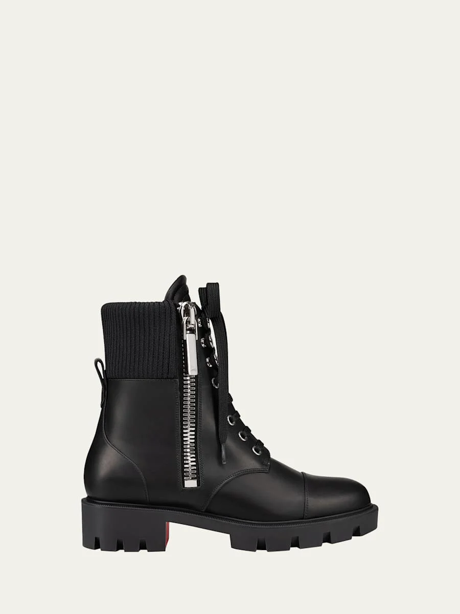 Christian Louboutin leather combat boots with knit collar Flat heel Round cap toe Lace-up vamp Side zip eases dress Lightweight, sturdy red TPU outsole Made in Italy Online Inquiries: BGS21_X69N0| Store Inquiries: #4623991