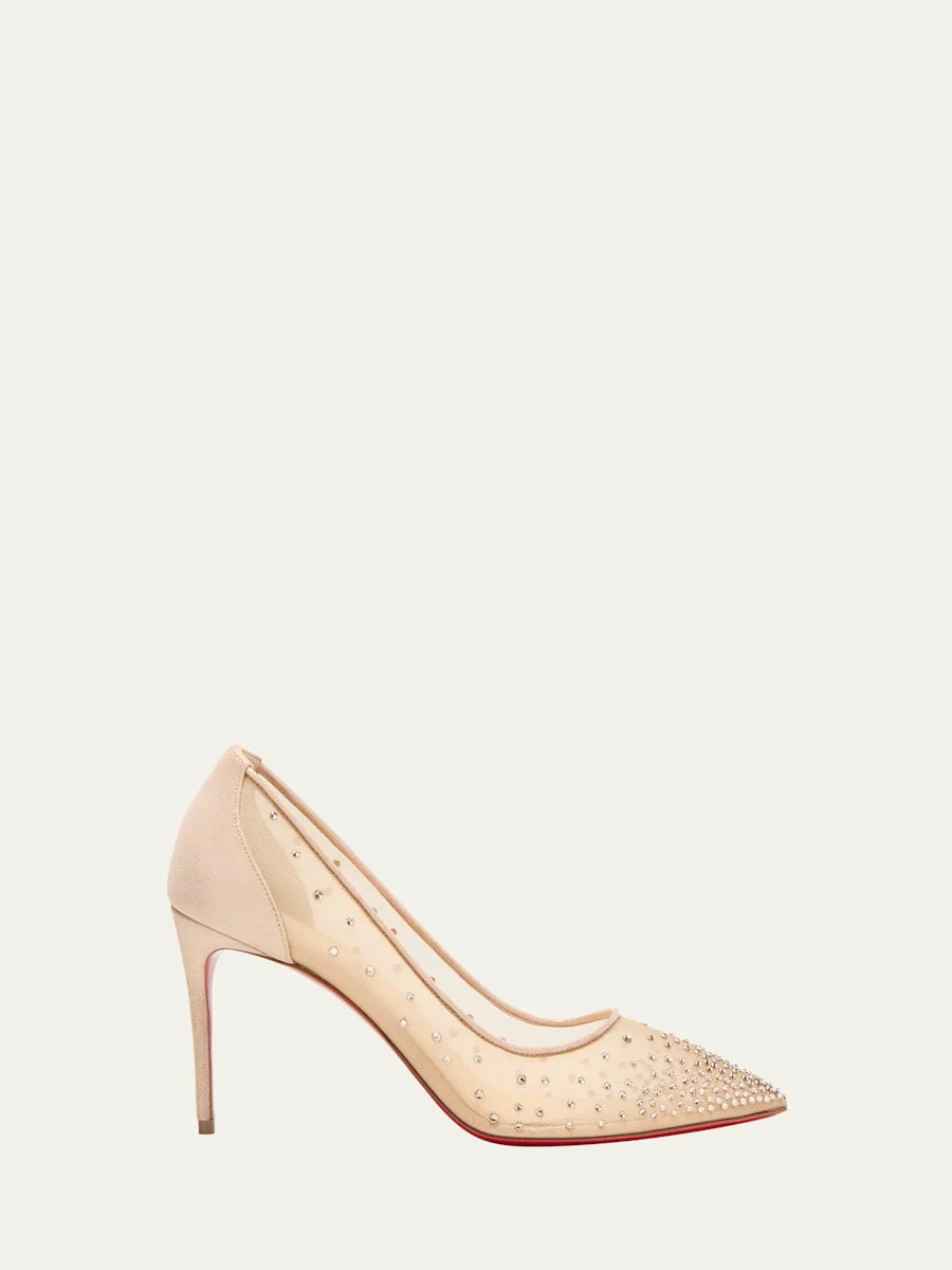 Christian Louboutin "Follies" mesh and metallic suede pumps with crystal embellishments. 3.3" covered stiletto heel. Pointed toe. Slip-on style. Signature red leather sole. Online Inquiries: BGS21_X4MYK| Store Inquiries: #3051595