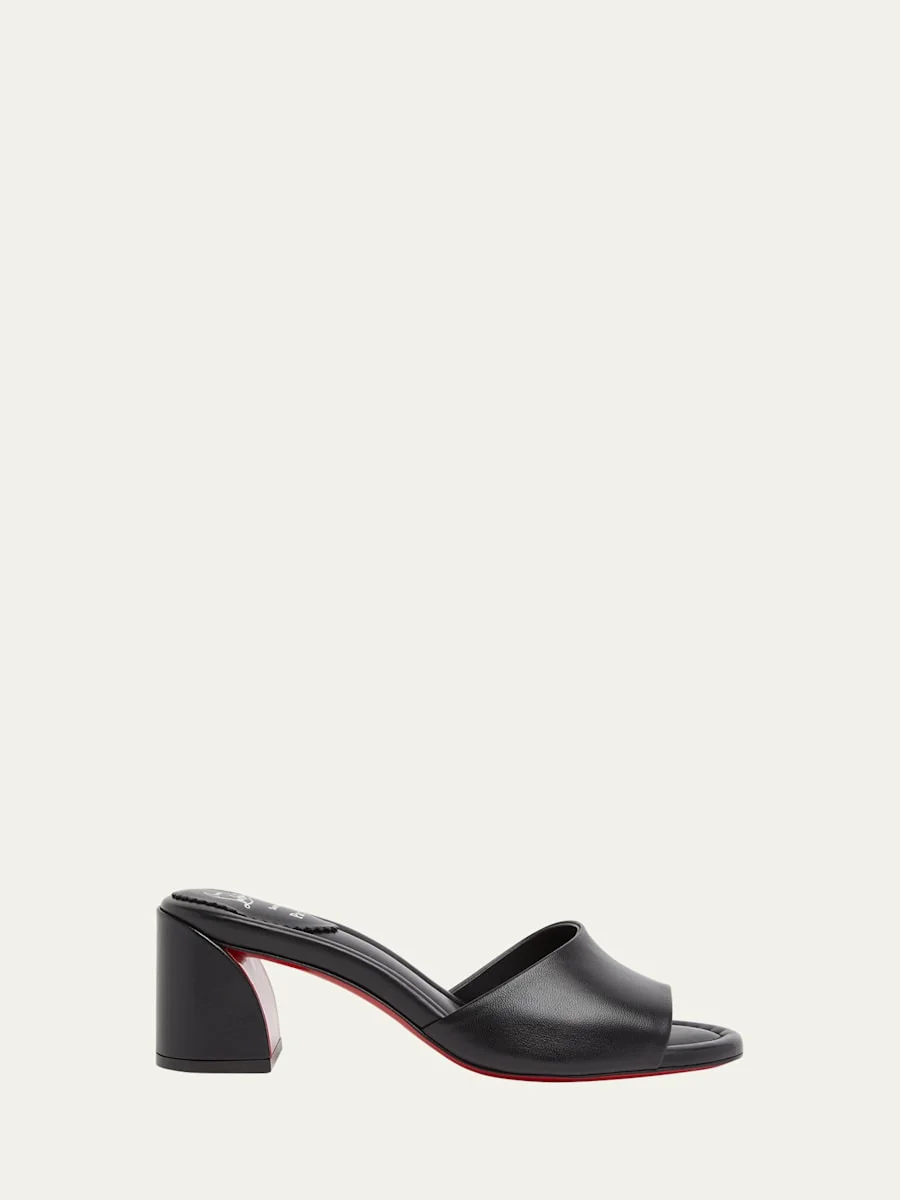 Christian Louboutin "Jane" smooth leather mule sandals. 2.25 in / 55 mm block heel. Open toe. Wide band upper. Slide style. Signature Louboutin red leather sole. Lining: Leather. Made in Italy. Online Inquiries: BGS21_X7F3J| Store Inquiries: #4889636