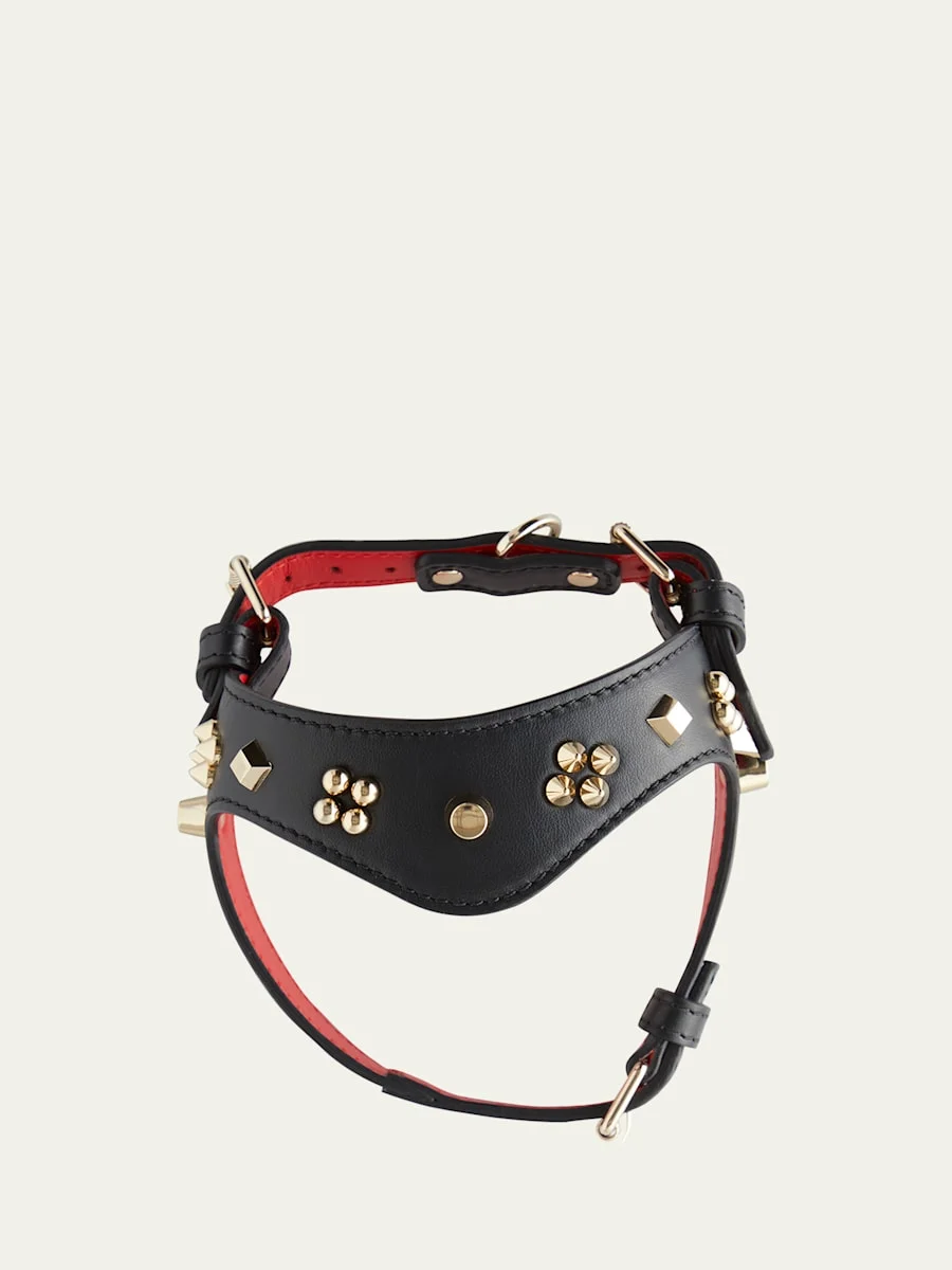 Adjustable leather dog harness features signature red lining and Cara spikes Three square buckles; two at neck, one at chest Four holes every 0.5" to adjust fit on each closure Dring leash attachment Neck circumference: 8.6" to 11.8" Chest circumference: 11.8" to 16.8" Made in Italy