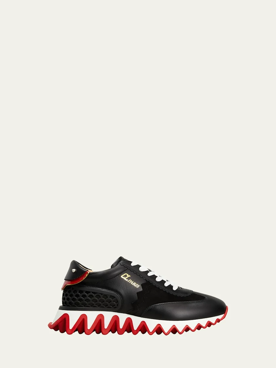 Christian Louboutin "Loubishark Donna" suede and leather runner sneakers. Flat heel. Round reinforced toe. Lace-up vamp. Spike and net detailing at backstay. Cushioned footbed. Signature red rubber sharktooth sole. Imported. Online Inquiries: BGS21_X57TV| Store Inquiries: #3684287