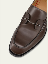 Christian Louboutin "Chambelimoc" loafers in calf leather Features side straps joined by an removable silvertone collar pin Stacked heel Round moc toe Leather lining Signature Loubi red leather outsole Slip-on style Made in Italy Online Inquiries: BGS21_NCFZ6| Store Inquiries: #4877507