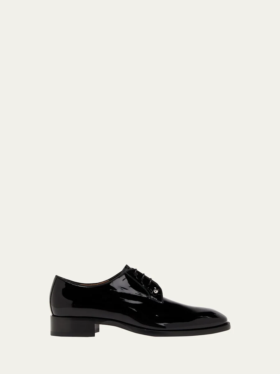 Christian Louboutin "Chambeliss" derby shoes in glossy patent leather features a removable silvertone bar piercing Stacked heel Round toe Lace-up vamp Signature Louboutin red leather outsole Made in Italy Online Inquiries: BGS21_NAWHZ| Store Inquiries: #4531415