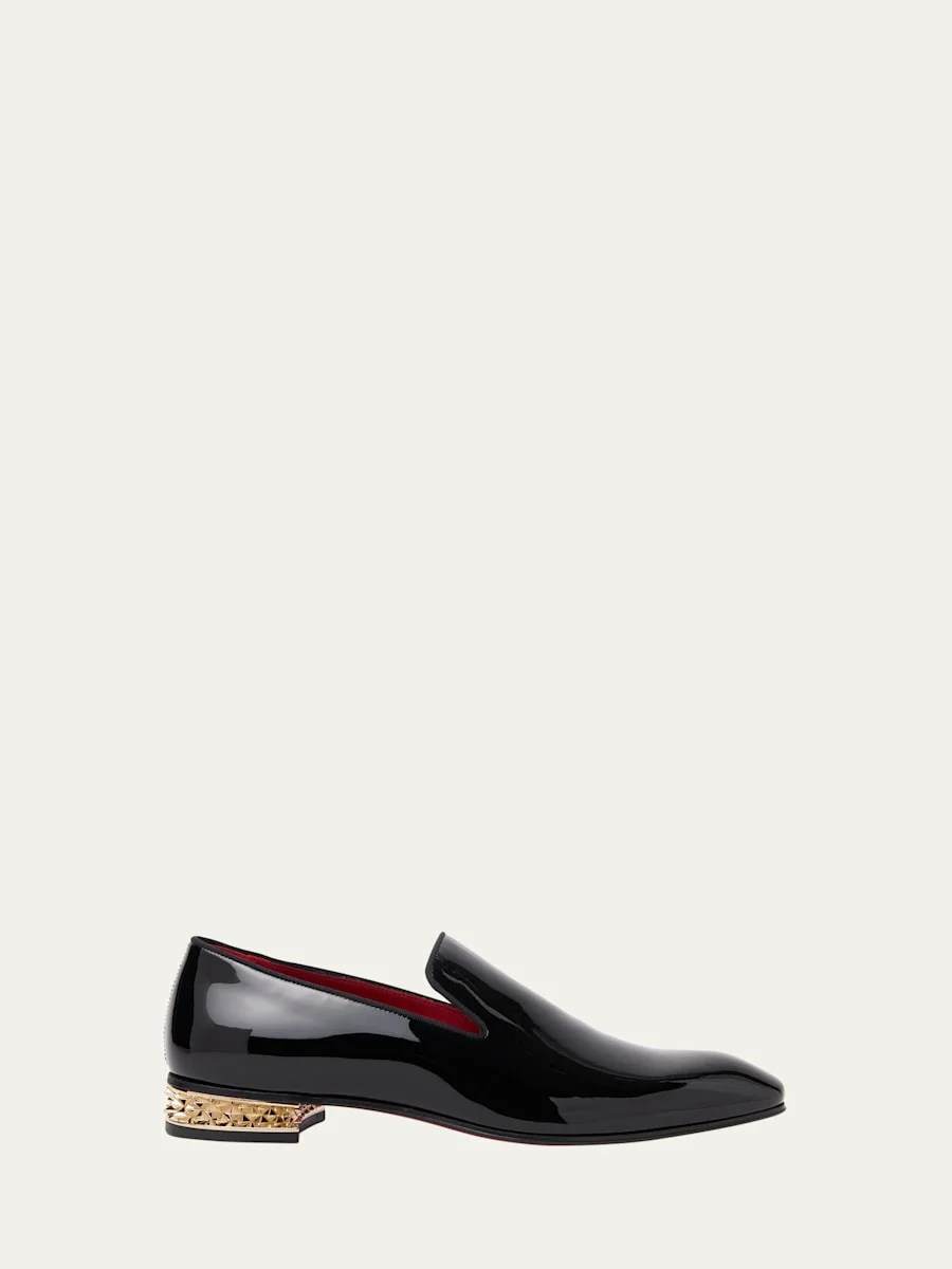 Christian Louboutin "Dandy Rocks" loafers crafted from glossy patent calf leather, defined by a heel adorned with goldtone signature spikes Grosgrain trim Stacked heel Almond toe Signature Loubi red lining and leather outsole Slipon style Made in Italy