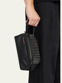 Christian Louboutin travel pouch crafted in grained calf leather, embellished with striking gunmetal spikes on the sides Side strap Zip closure Widemouth opening Exterior, one zip pocket Interior, two card slots Signature Loubi red lining Logo signature on the base Approx. 4.7"H x 9.0"W x 4.3"D Made in Italy