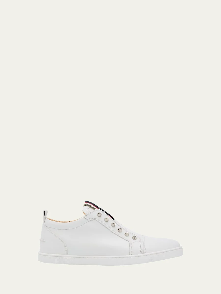 Christian Louboutin low-top sneaker in smooth calf leather. Round toe. Laceless vamp with silvertone spikes. Large logo tag at tongue. Tabbed backstay. Slip-on style. Rubber sole. Made in Italy. Online Inquiries: BGS21_N6YK7| Store Inquiries: #3436768