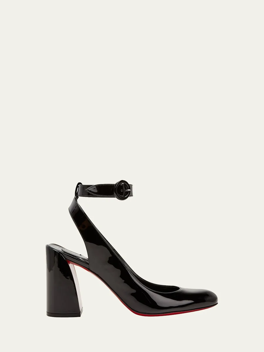 Christian Louboutin "Miss Sab" patent calf leather pumps 3.25 in / 85 mm chunky block heel Round toe Adjustable ankle buckle Signature Louboutin red leather outsole Made in Italy Online Inquiries: BGS21_X5UAL| Store Inquiries: #4365677
