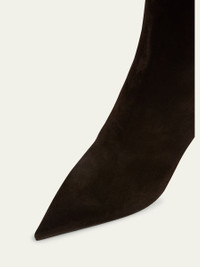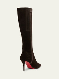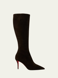 Christian Louboutin "Kate" suede knee-high boots 3.25 in / 85 mm stiletto heel Pointed toe Side zip eases dress Signature Louboutin red leather outsole Lining: Unlined Made in Italy Online Inquiries: BGS21_X6WAJ| Store Inquiries: #5017928