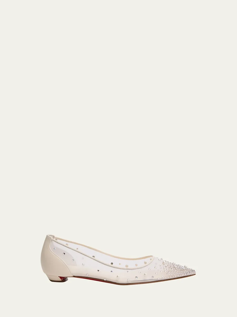 Accented with a smooth leather heel counter and trim, the "Miss Z Degrastra" ballerina flats by Christian Louboutin are designed in sheer mesh with rhinestone and faux pearl embellishments Stacked flat heel Pointed toe Slipon style Signature Louboutin red leather outsole Made in Italy
