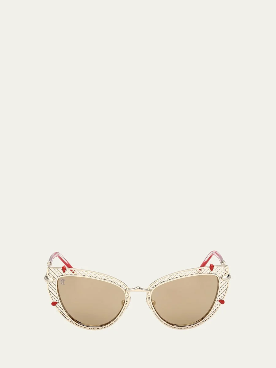 Christian Louboutin "LB0002W54" cat-eye sunglasses in metal Eye/bridge/temple (in mm): 54-19-135 Solid lenses Adjustable nose pads Thin, tapered arms Logo at lens Metal Spot clean 100% UVA/UVB protection Made in Italy Proposition 65 warning for California residents Online Inquiries: BGS21_D59GE| Store Inquiries: #5028805