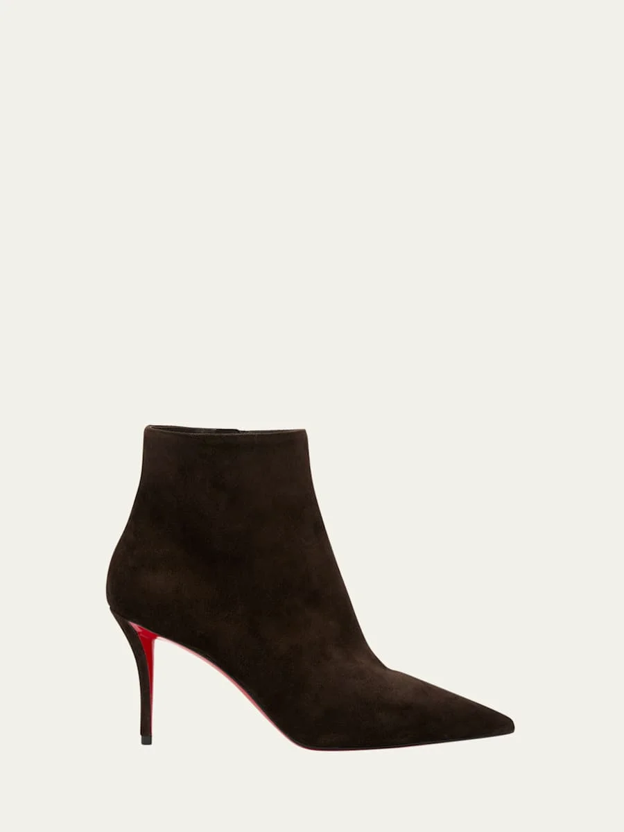 Christian Louboutin "Miss Z" suede booties 3.15 in / 80 mm stiletto heel Pointed toe Side zip eases dress Signature Louboutin red leather outsole Lining: Unlined Made in Italy Online Inquiries: BGS21_X6W9R| Store Inquiries: #5017900
