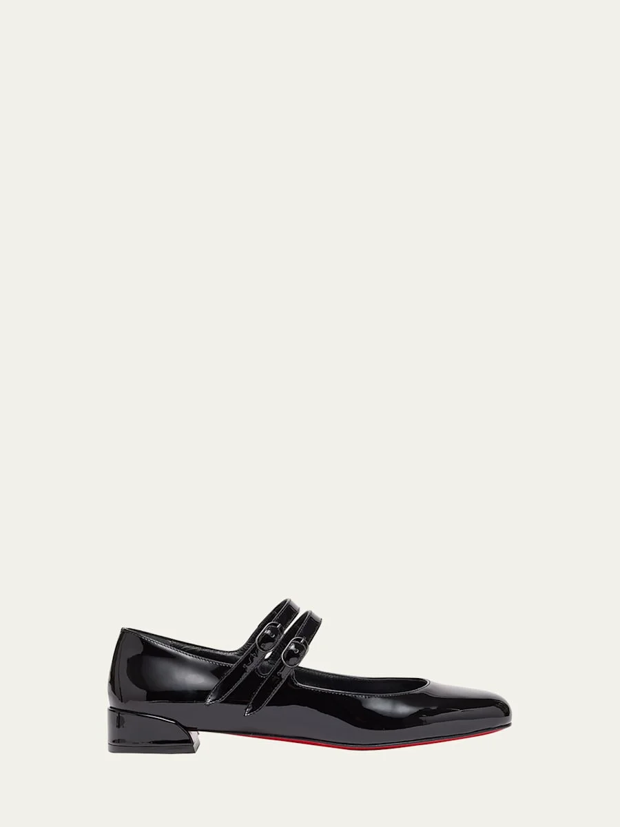 Christian Louboutin "Sweet Jane" patent leather ballerina flats. Round toe. Dual Mary Jane buckle straps. Signature red leather sole. Made in Italy. Online Inquiries: BGS21_X69GA| Store Inquiries: #4621396