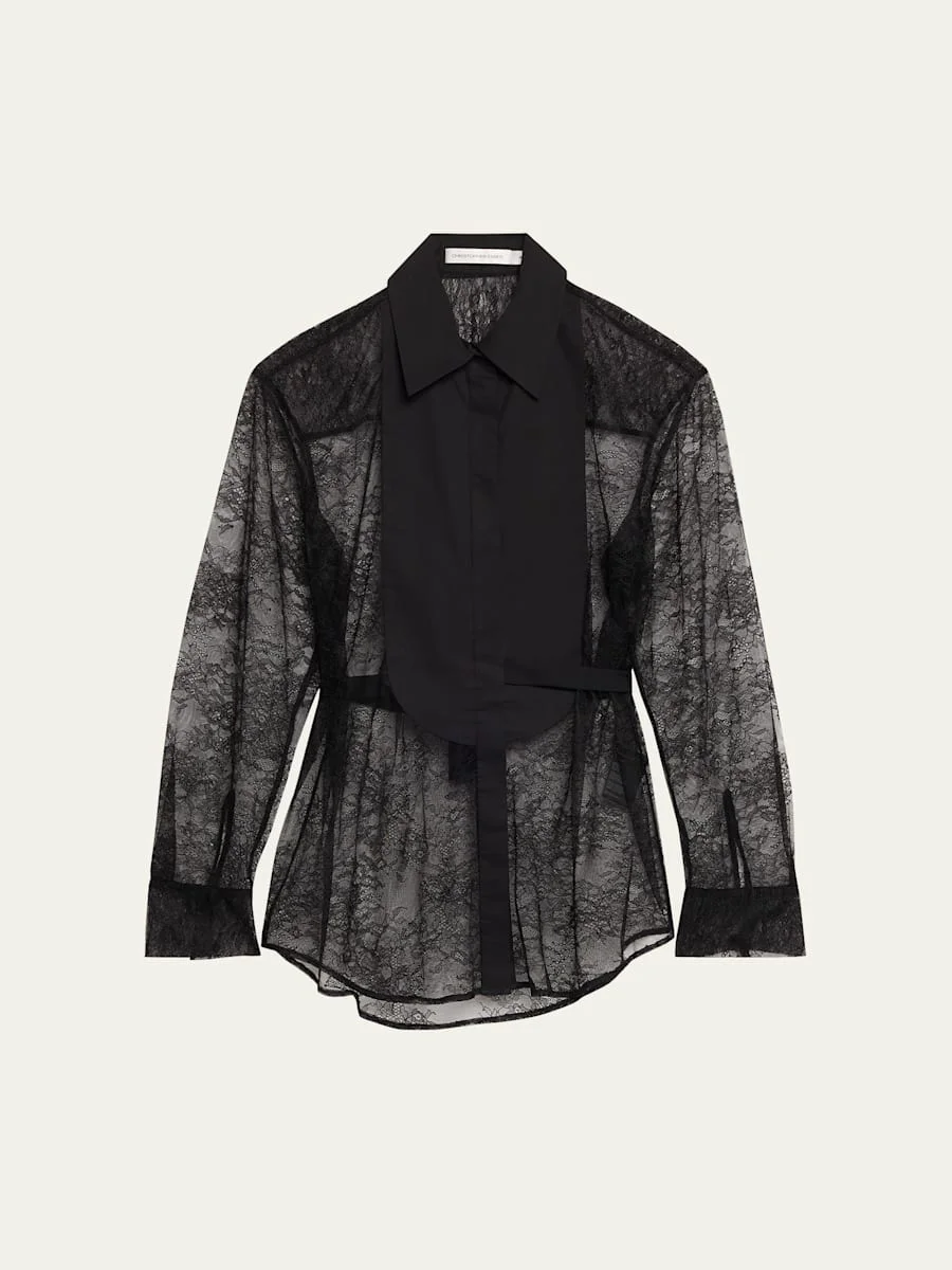 Christopher Esber lace tuxedo shirt featuring a solid bib front panel and a waist tie detail Point collar; button front Long sleeves; button cuffs Yoked back; box pleat Relaxed fit Nylon/polyamide/cotton/viscose Dry clean Imported Online Inquiries: BGS21_BA4N3| Store Inquiries: #5035195