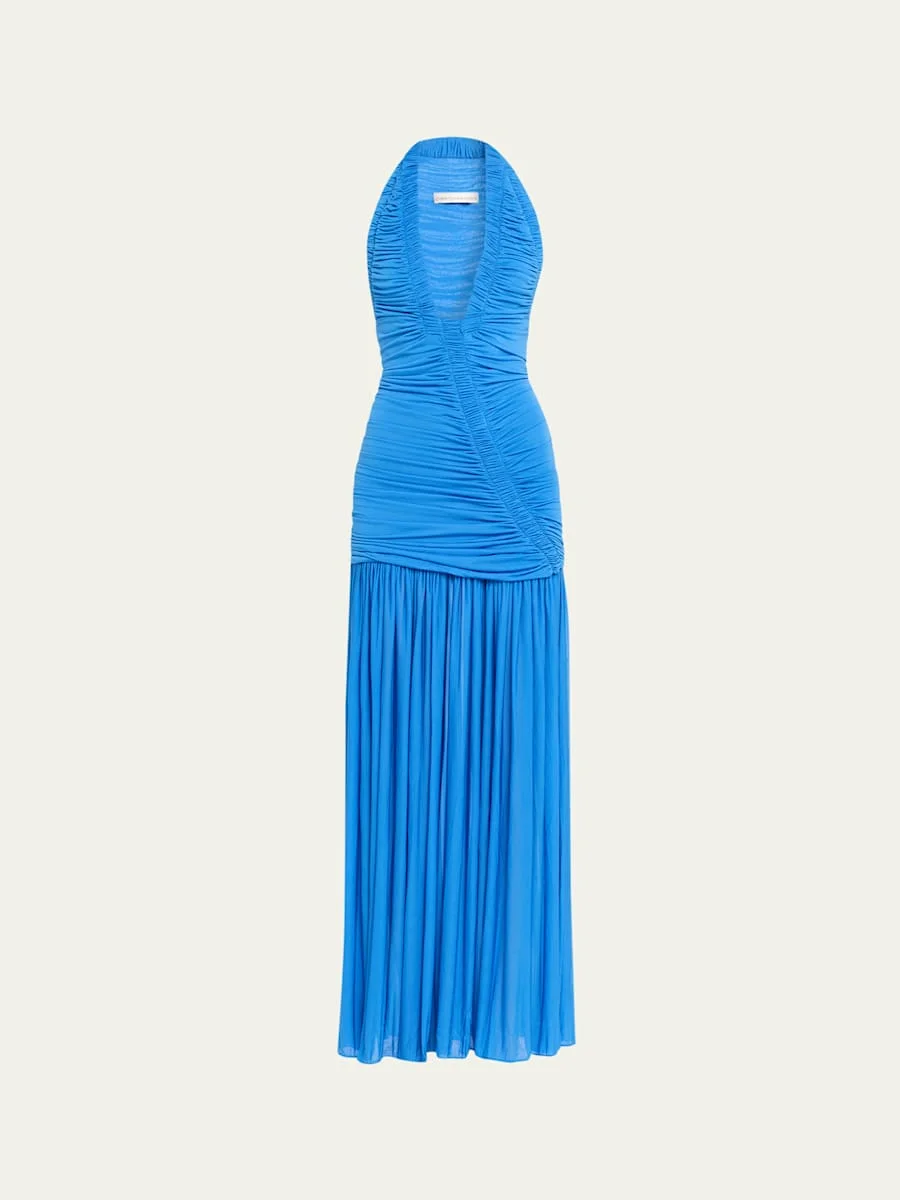 Christopher Esber "Orion" gown with handsculpted ruching Plunging V neckline; racerback inspired halter straps Sleeveless Dropwaist maxi silhouette Pleated skirt Full length Rayon/cellulose acetate/polyester Dry clean Imported