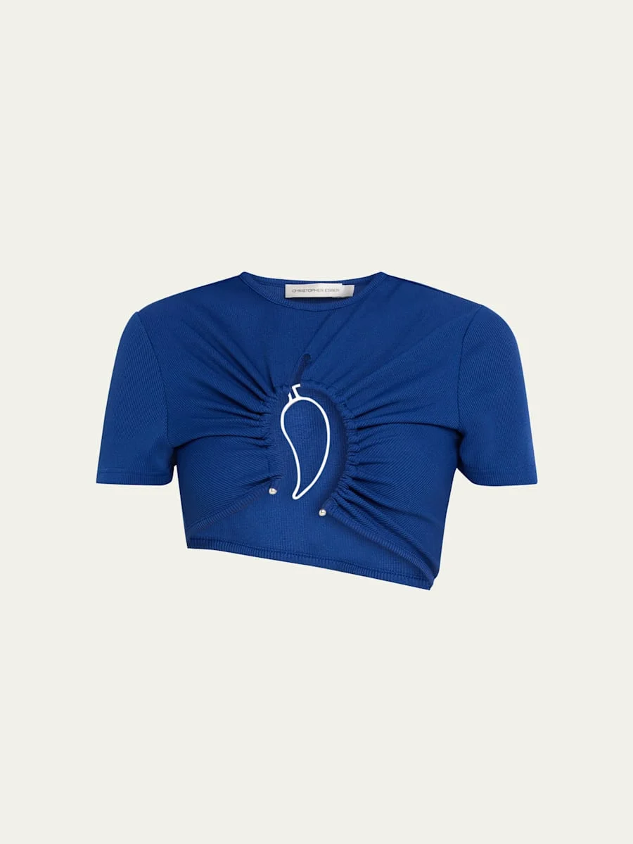 Christopher Esber ribbed T-shirt featuring a ruched paisley ring Crew neckline Short sleeves Fitted Cropped length Pullover style Spandex/polyester/copper Dry clean Imported Online Inquiries: BGS21_BA76Q| Store Inquiries: #5044906