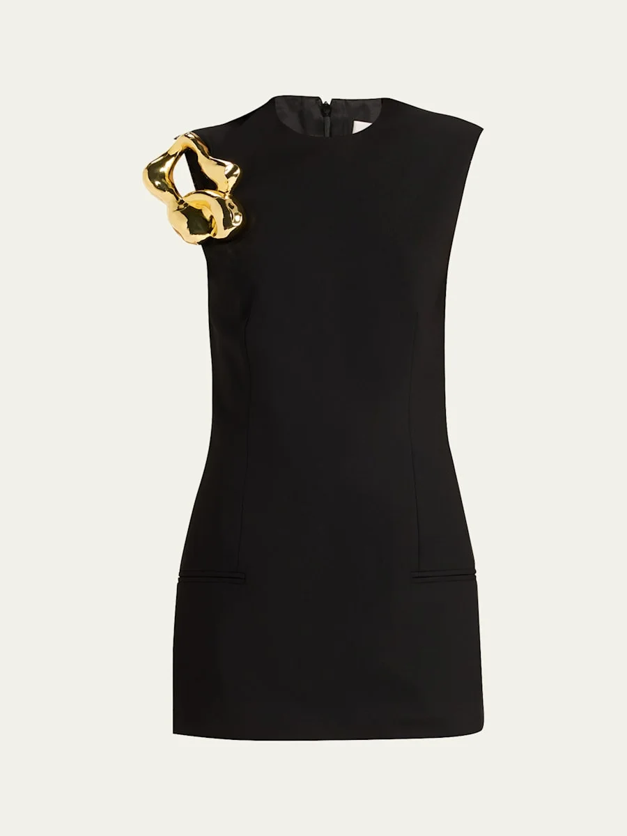 Sleek minimalism meets striking detail in this Christopher Esber dress, defined by precise tailoring, a sculpted metallic corsage adorns the shoulder, and raw-edge finishing adds an unexpected edge Round neckline Sleeveless Hip welt pockets Sheath silhouette Mini length Back zip Wool/elastane/viscose Dry clean Imported Online Inquiries: BGS21_BA76L| Store Inquiries: #5044902
