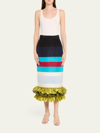 Striped Embroidered Ruffle-Hem Midi Skirt