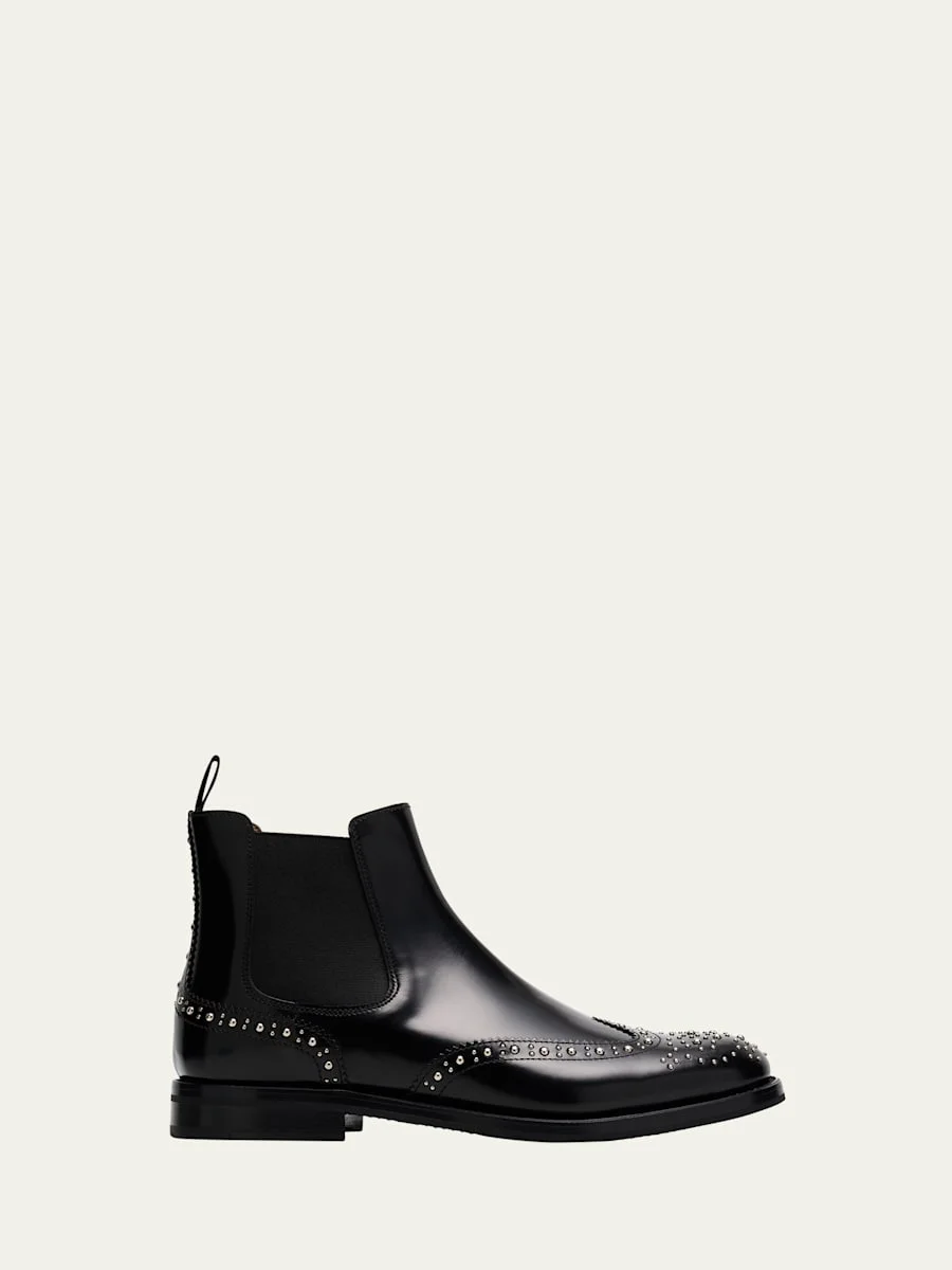 Church's "Ketsby" chelsea boots in polished calf leather with metal stud details with brogue trim 0.25 in / 10 mm flat heel Round toe Elastic gored sides Pull-tab at backstay Pull-on style Leather lining Rubber outsole Made in Italy Online Inquiries: BGS21_X6YUK| Store Inquiries: #5062179