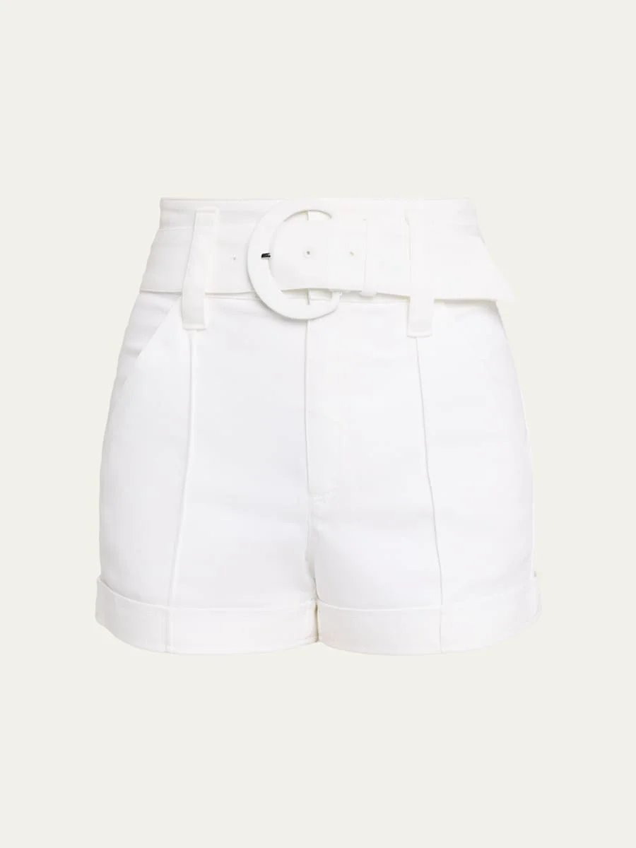 Cinq a Sept "Aldi" denim shorts detailed with a belted waist and pintuck front that elongates the leg High rise Angled front pockets; back welt pockets Slim fit Cuffed hem Button/zip fly; belt loops Cotton/polyester/elastane Lining: Cotton Machine wash cold Imported SIZE amp; FITModel measurements: 5'10" tall Model is wearing a US size 4/Small
