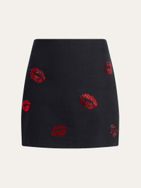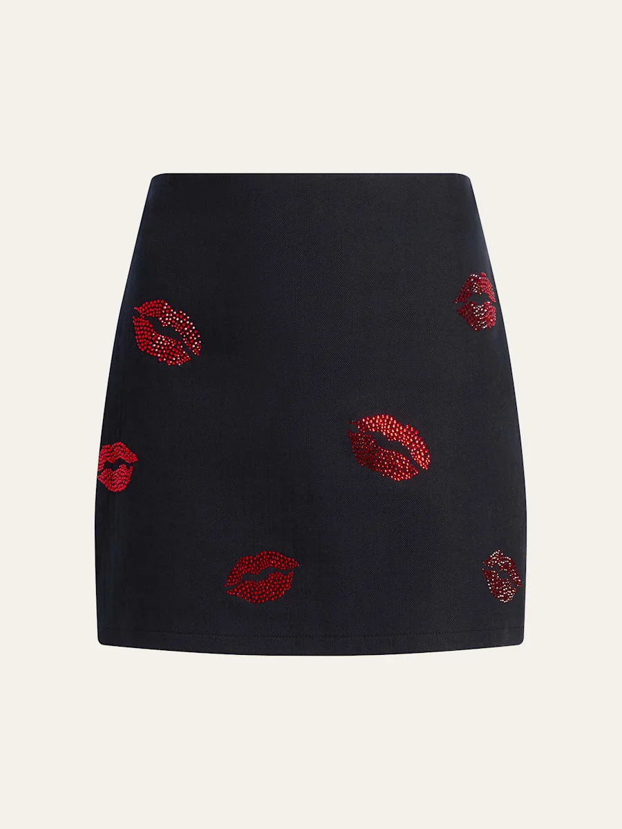 Cinq a Sept "Doris" denim mini skirt embellished with shimmering rhinestone kiss accents High rise Skirt falls straight from hip to hem Hem falls above the knee Center back zip Cotton/spandex Fully lined Dry clean Imported