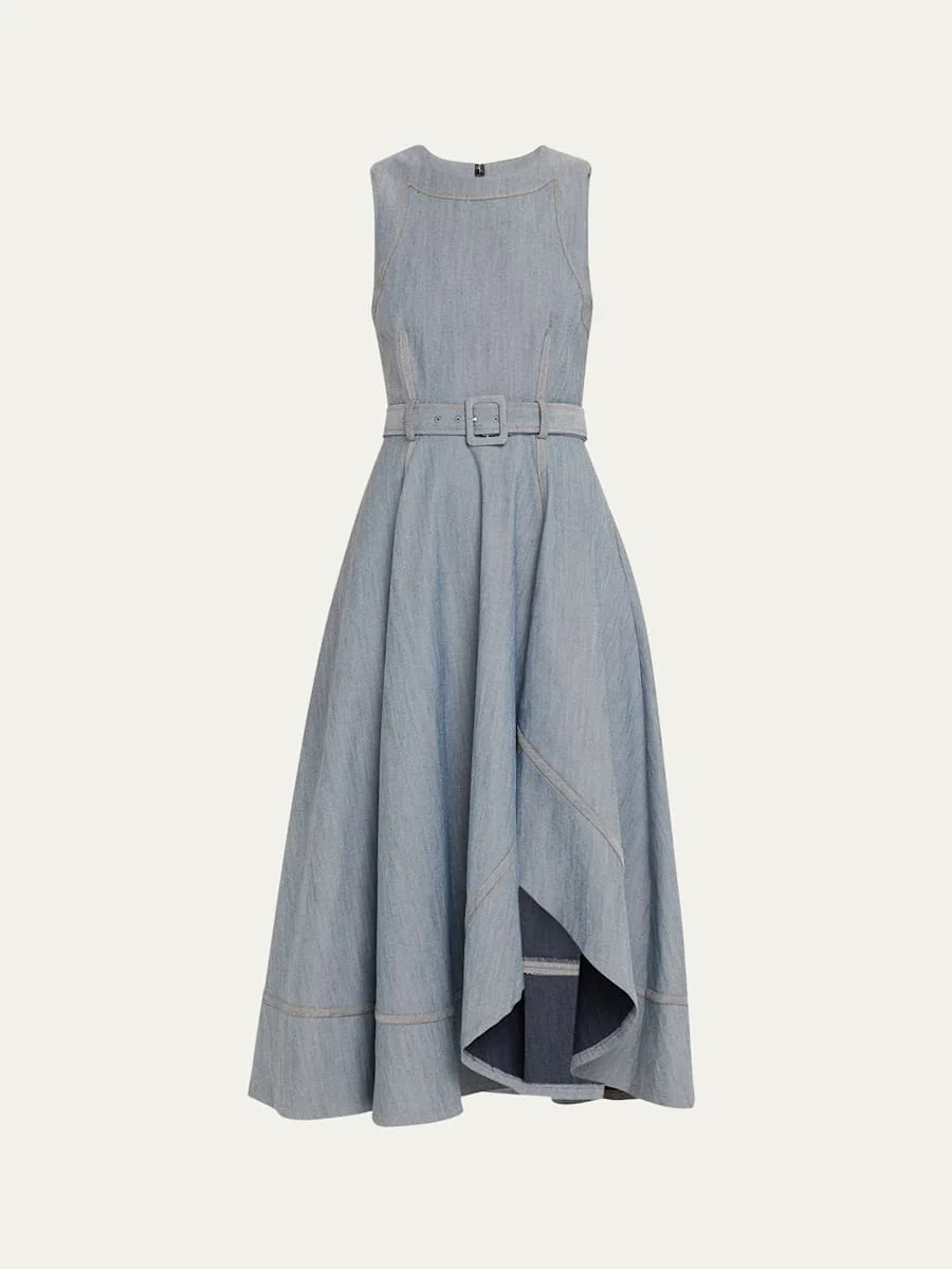 Zelda Belted Asymmetric Sleeveless Denim Midi Dress
