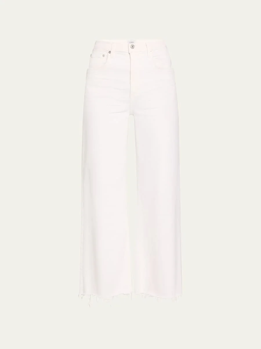 Our Lyra is a vintage-inspired silhouette that sits high on the waist. It has an easy, relaxed top block cut, a cropped inseam, and a voluminous raw hem wide leg. Citizens of Humanity "Lyra" jeans featuring a raw hem in white denim High rise Five-pocket style Wide legs Cropped length Button/zip fly; belt loops Cotton/polyester/elastane Imported Online Inquiries: BGS21_T6G82| Store Inquiries: #4973807