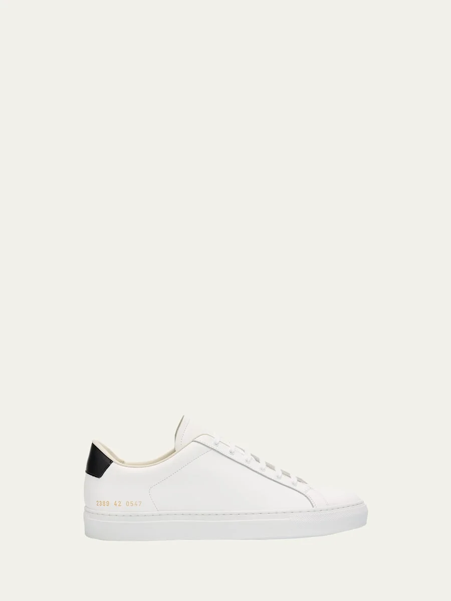 Common Projects "Retro Classic" low-top court sneakers in smooth leather with contrast leather backstay Style has a wider toe box than the Achilles style Flat heel Round toe Lace-up vamp Golden embossed numbers at heel Rubber outsole Made in Italy Online Inquiries: BGS21_NC6CJ| Store Inquiries: #4816795