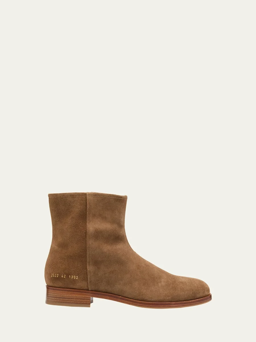 Common Projects ankle boots in supple suede for an understated finish Unique foiled serial code on the side Chunky heel Round toe Leather lining Side zip for easy on and off Leather outsole Made in Italy
