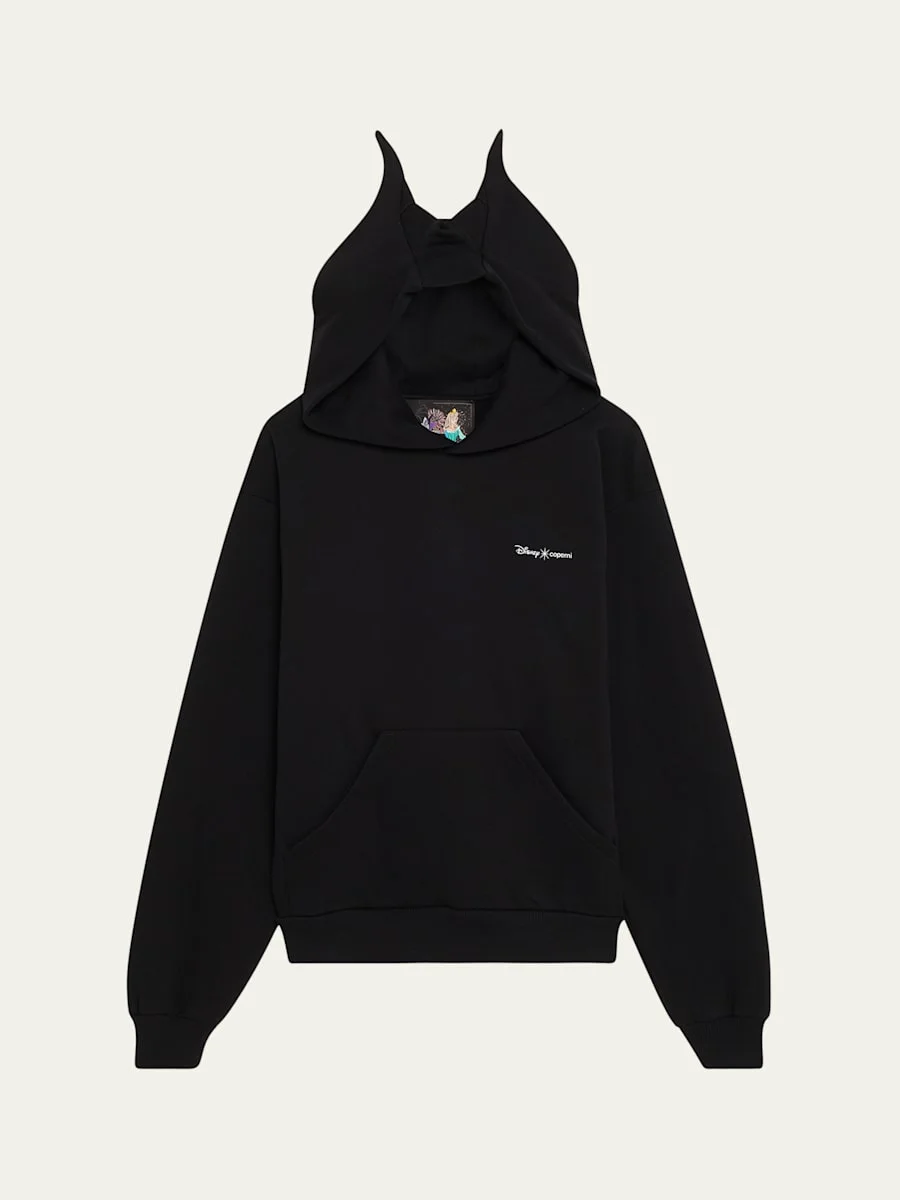 Inspired by Maleficent, this sweatshirt by Coperni x Disney features intricately shaped corners at the hood to mimic horns Hooded neckline Dropped shoulders Long sleeves Kangaroo pouch pocket Relaxed fit Hip length Pullover style Organic cotton Made in Portugal