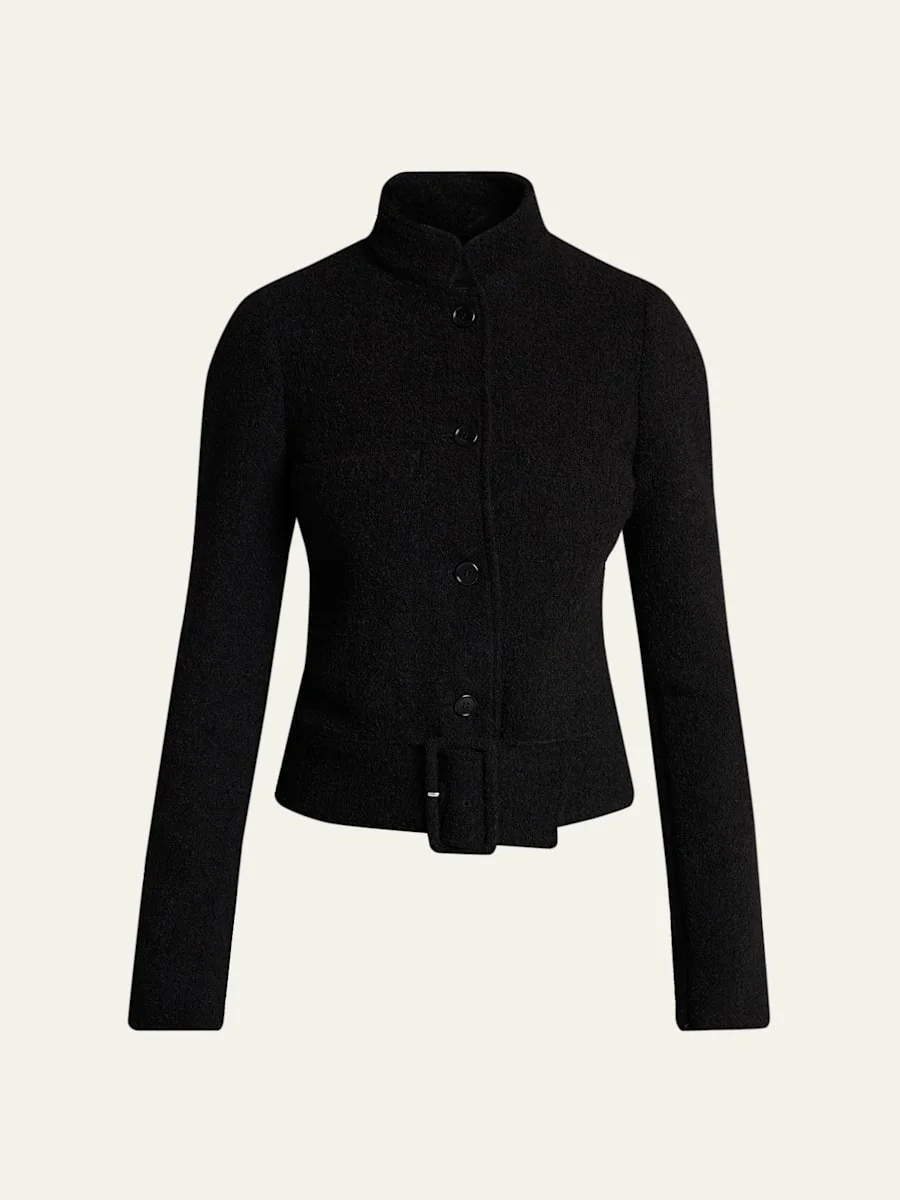 Courreges "Heritage" jacket is crafted from boucle featuring a wide buckle belted hem and a monogram embroidered back of neck Mandarin collar; singlebreasted front Long sleeves; zip cuffs Chest welt pockets Slim fit Hip length Buckle hem Butotn closure Polyester/cotton/nylon/polyamide Imported