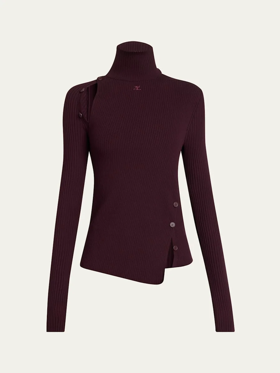 Courreges sweater is crafted of a soft ribbed knit featuring buttoned cutouts along the shoulder and hip Turtleneck Long sleeves Logo embroidered chest Slim fit Pullover style Viscose/polyester Made in Bulgaria Online Inquiries: BGS21_BAZGZ| Store Inquiries: #5357275