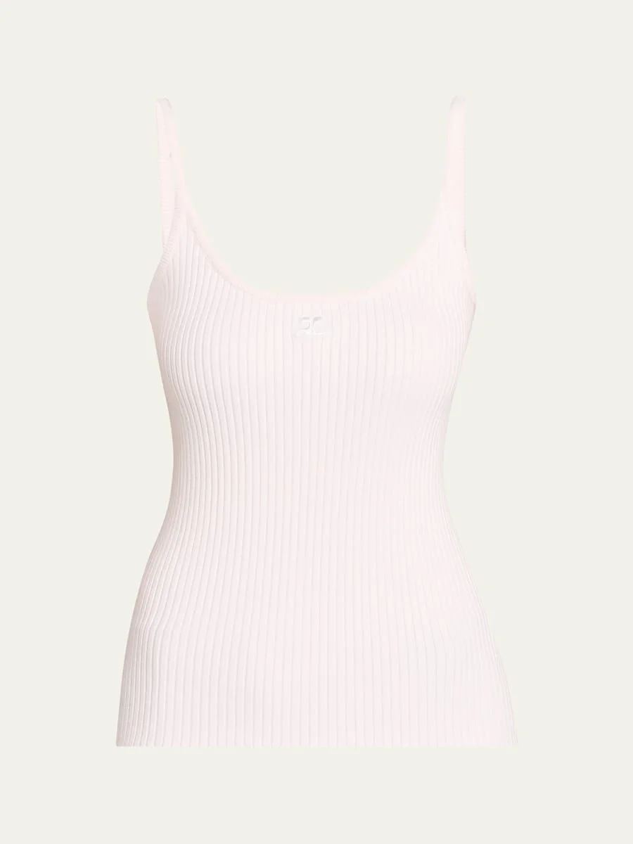 Courreges ribknit tank top with logo detail Scoop neckline Sleeveless Slim fit Pullover style Viscose/polyester Made in Bulgaria