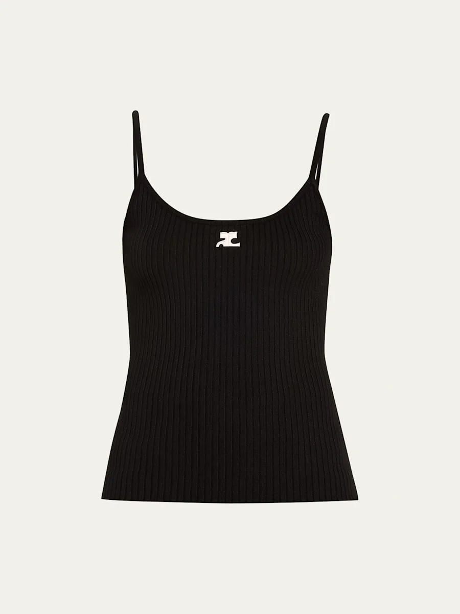 Courreges ribknit tank top with logo detail Scoop neckline Sleeveless Slim fit Pullover style Viscose/polyester Made in Bulgaria