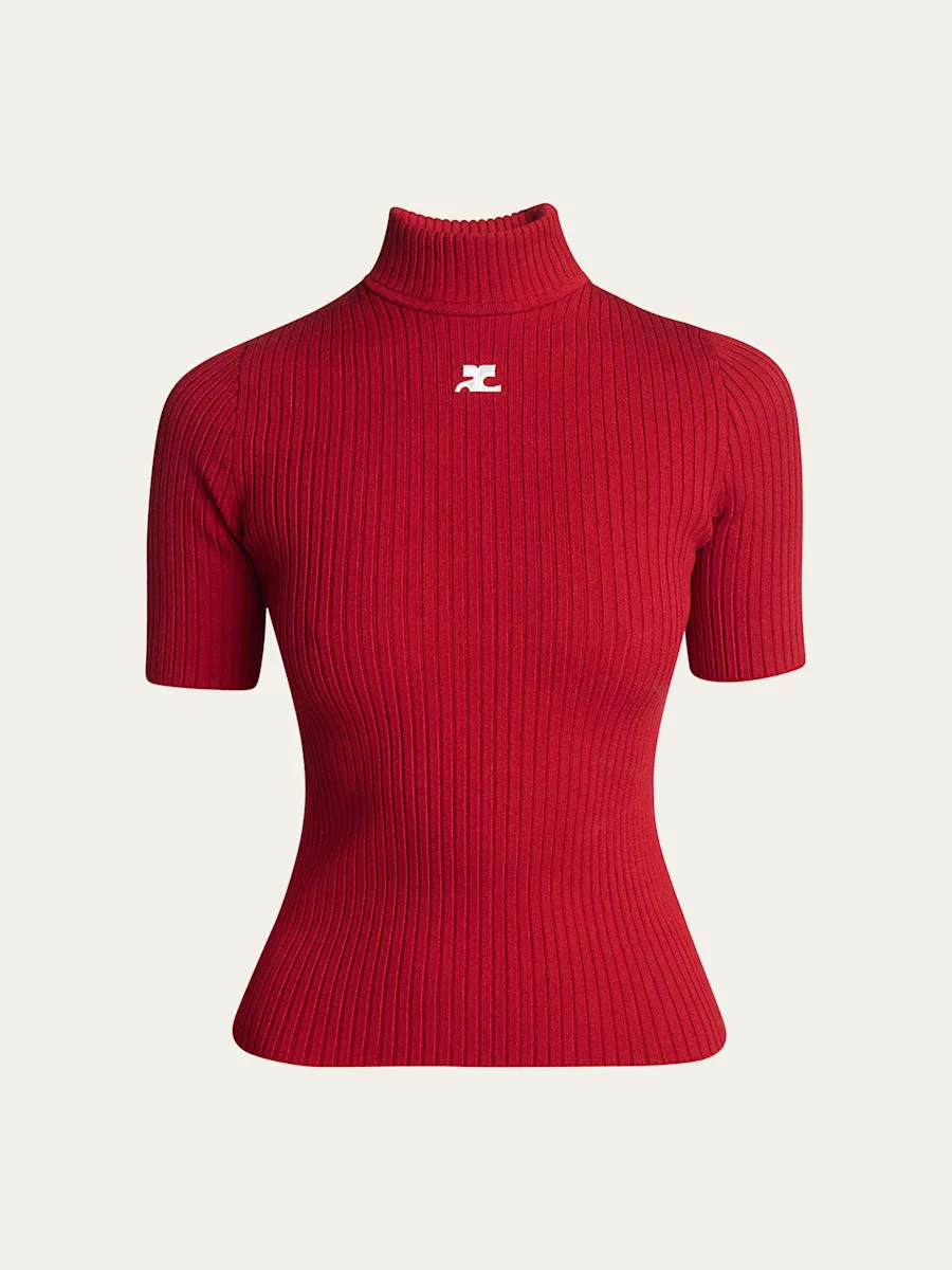 Courreges ribbed knit sweater features logo embroidered front Mock neckline Short sleeves Fitted Pullover style Viscose Imported