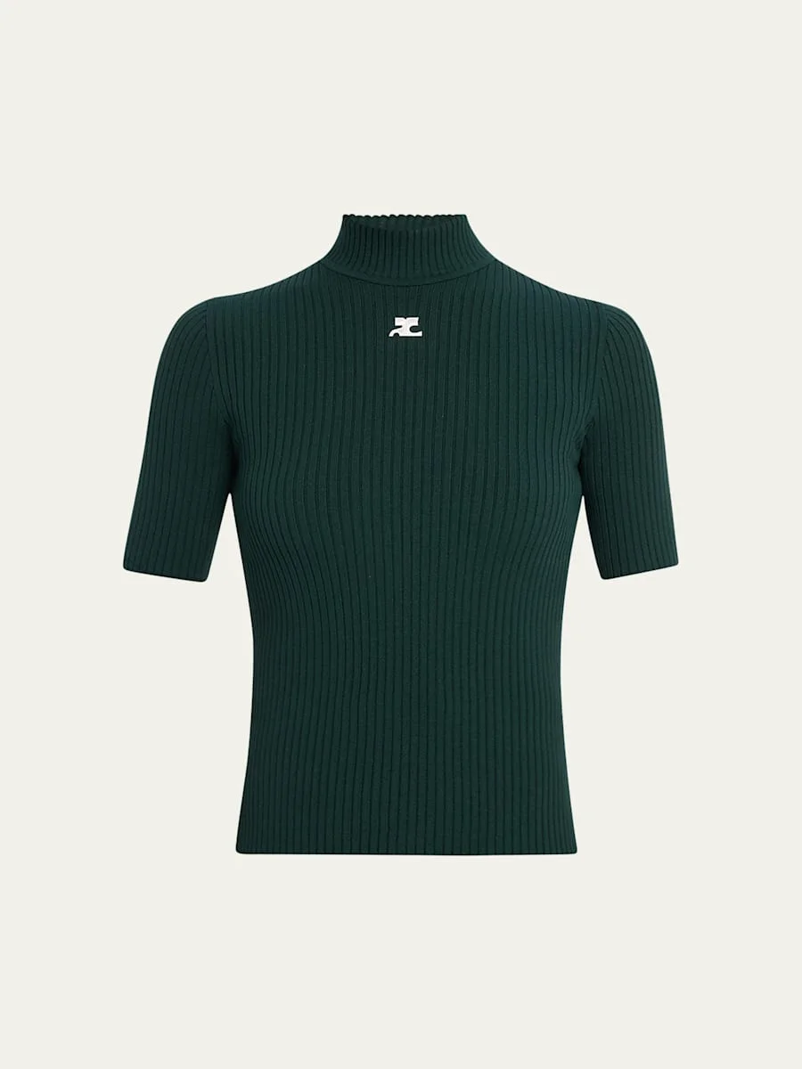 Courreges ribbed knit sweater features logo embroidered front Mock neckline Short sleeves Fitted Pullover style Viscose Imported
