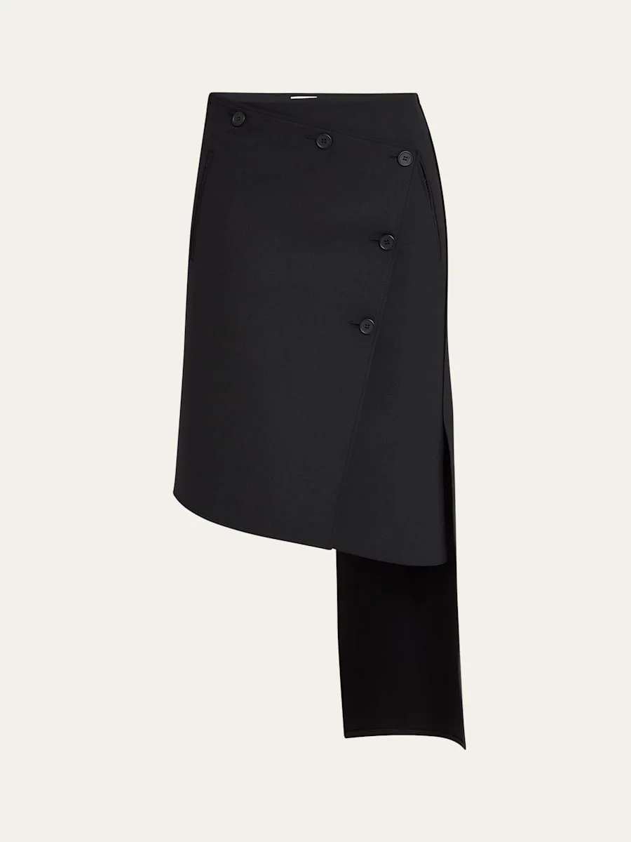 Courreges wrap skirt is crafted from oblique polywool crepe featuring a buttoned front and an asymmetric hem with a side panel Mid waist Skirt falls straight from hip to hem Highlow hem Button closure Polyester/wool/elastane Made in Romania