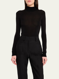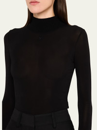 Courreges Re-Edition top featuring ribbed knit trim and logo embroidered chest Mock neckline Long sleeves; ribbed cuffs Fitted Second skin fit Pullover style Viscose/elastane Made in France Online Inquiries: BGS21_B9BGN| Store Inquiries: #4829495