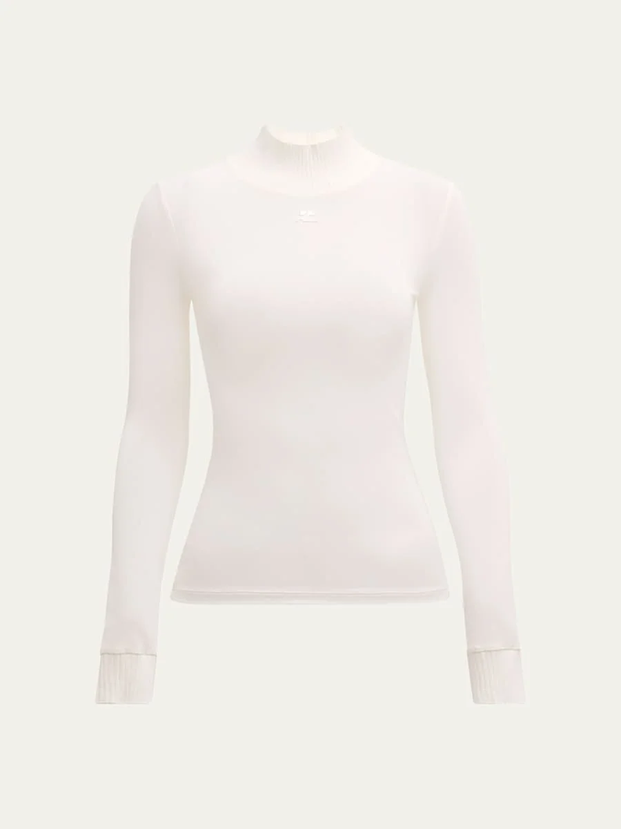 Courreges ReEdition top featuring ribbed knit trim and logo embroidered chest Mock neckline Long sleeves; ribbed cuffs Fitted Second skin fit Pullover style Viscose/elastane Made in France