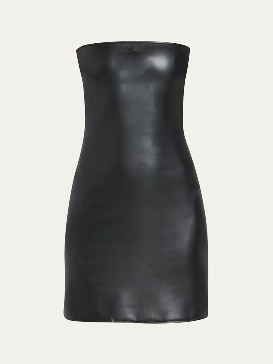Courreges dress is crafteed of a faux leather featuring a logo embroidered chest and a sheer back strap cutout Strapless neckline Sleeveless Aline silhouette Mini length Hookandeye back strap closure Nylon/polyamide/elastane Made in France