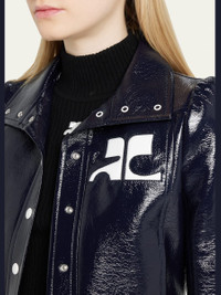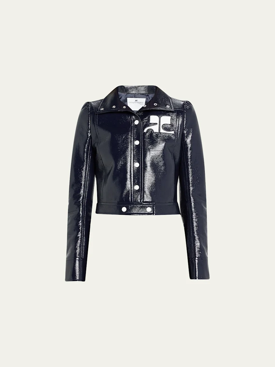 Courreges textured vinyl jacket featuring contrast logo patch chest Part of the Iconic vinyl collection Approx. 19"L from shoulder to hem; 25.2" sleeve length Spread collar; snap front Long sleeves Side slip pockets Straight fit Cropped length Cotton Cupro, lining Imported Model is 5'10"/177cm. Online Inquiries: BGS21_B7HPD| Store Inquiries: #4366285