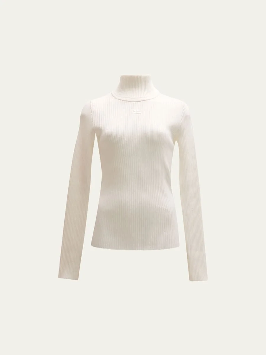 Courreges rib sweater featuring contrast logo embroidered front Turtleneck Long sleeves Fitted Pullover style Viscose Imported