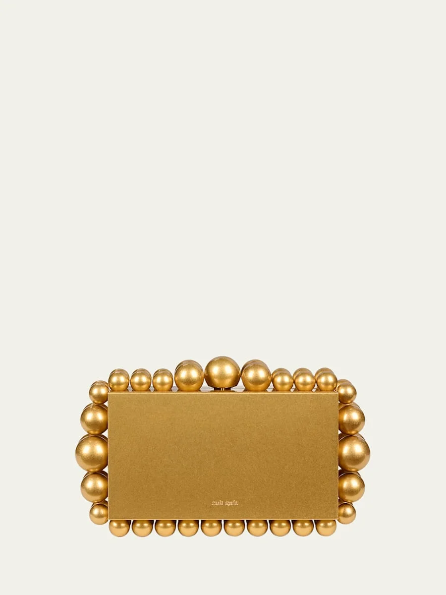 Cult Gaia "Eos" box-shaped clutch bag in aluminum, adorned with coordinating beads in antique-finished brass Framed top with clasp closure Approx. 5.31"H x 9.1"W x 2.4"D Spot clean Imported Online Inquiries: BGS21_V6L10| Store Inquiries: #5035837