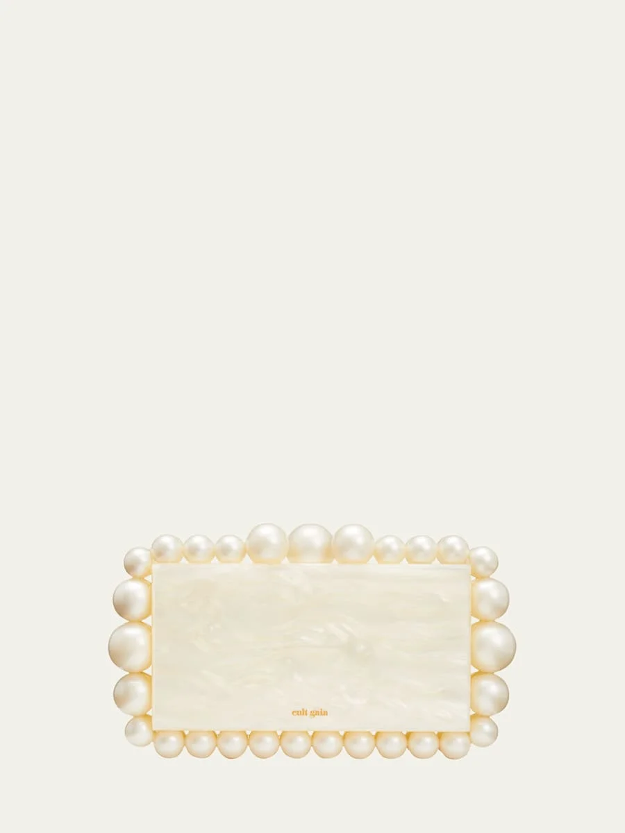 Cult Gaia clutch bag in acrylic with pearly trim Pearly ball lift-bar clasp Hinge bottom Fragile, do not drop, handle with care Item weight: 2 lbs. Approx. 7"L x 3.75"H x 2.5"W "Eos" is imported Online Inquiries: BGS21_V4NVY| Store Inquiries: #3534973