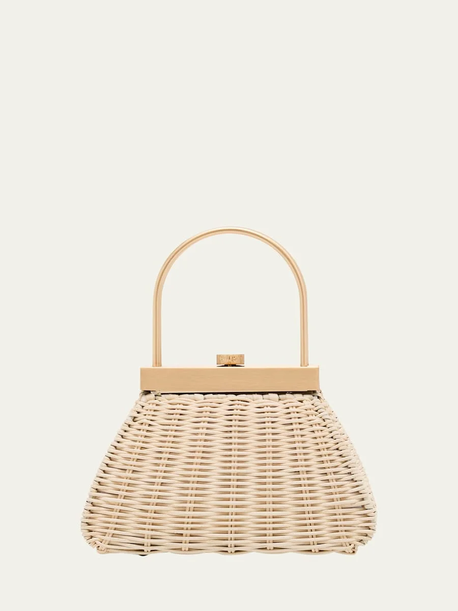 Vintage inspired, the "Estelle" top-handle bag from Cult Gaia is crafted in natural woven rattan with gold-tone metal Top handles Structured top with clasp closure Lining: Cotton Trim: Leather Approx. 5.1"H x 7.9"W x 3.9"D Imported Online Inquiries: BGS21_V6LAB| Store Inquiries: #5039335