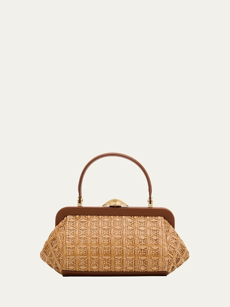 Cult Gaia "Zuma" crossbody bag in woven polyurethane, polyester, cotton, and leather Top handle, 4.2"L Detachable, adjustable crossbody strap Can be worn as a top handle or crossbody bag Framed top with brass clasp closure Approx. 6.8"H x 3.7"W x 3.5"D Imported Online Inquiries: BGS21_V6DQB| Store Inquiries: #4923023