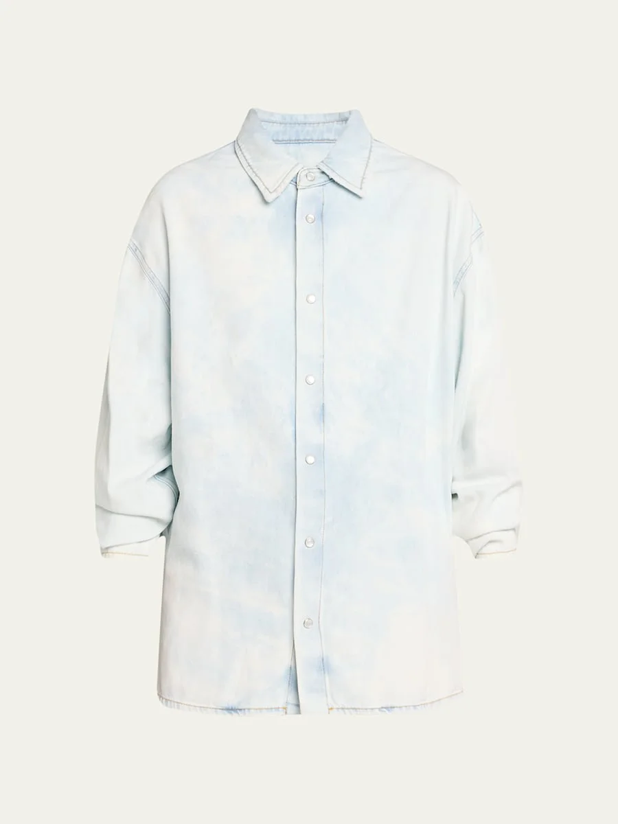DARKPARK "Keanu" tencel denim shirt featuring long ruched sleeves Point collar Dropped shoulders Oversized fit Hem falls to the hip Snap-front Cotton/Tencel® lyocell Made in Italy Model is 5'10"/177cm. Online Inquiries: BGS21_T5PE0| Store Inquiries: #4783867