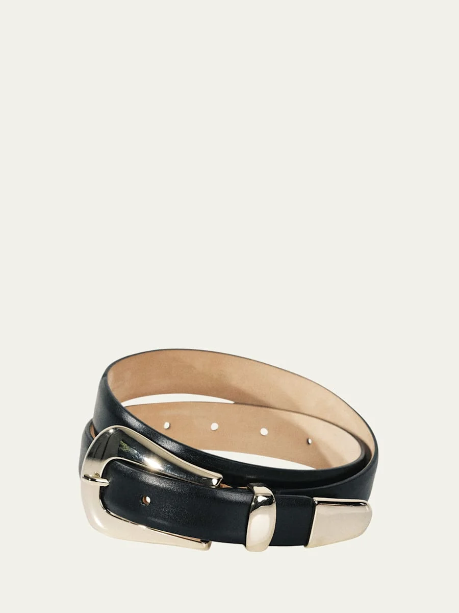 Dehanche "Colette" belt handcrafted of smooth calfskin leather Approx. 37.5"L x 1.0"W Features 10 holes to accommodate a broader size range Adjustable fit Signature suede lining Buckle closure Certified by the Leather Working Group (LWG) Leather/zamak Spot clean Made in Italy Online Inquiries: BGS21_D5A0Z| Store Inquiries: #5036135
